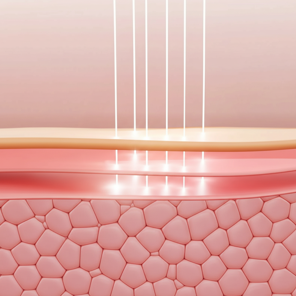 La lumière pénètre la peau sur plusieurs centimètres. La lumière rouge agit principalement sur les couches superficielles de la peau, tandis que la lumière infrarouge pénètre plus en profondeur, atteignant également les muscles et les tissus sous-jacents.